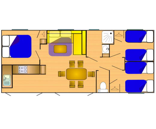 Externe en interne kleuren, en de inrichtingen en de ontwerpen van de accommodatie kunnen afwijken van de beschrijvingen gegeven en getoond. Overdekte houten veranda en airconditioning zijn enkel beschikbaar in geselecteerde stacaravans. Als een foto een overdekte houten veranda bij de stacaravan weergeeft, houdt dit niet in dat alle stacaravans van dit model ook van een overdekte houten veranda zijn voorzien. Op elke campingpagina geven we aan welke stacaravans met houten veranda, overdekte houten veranda en airconditioning zijn uitgerust.